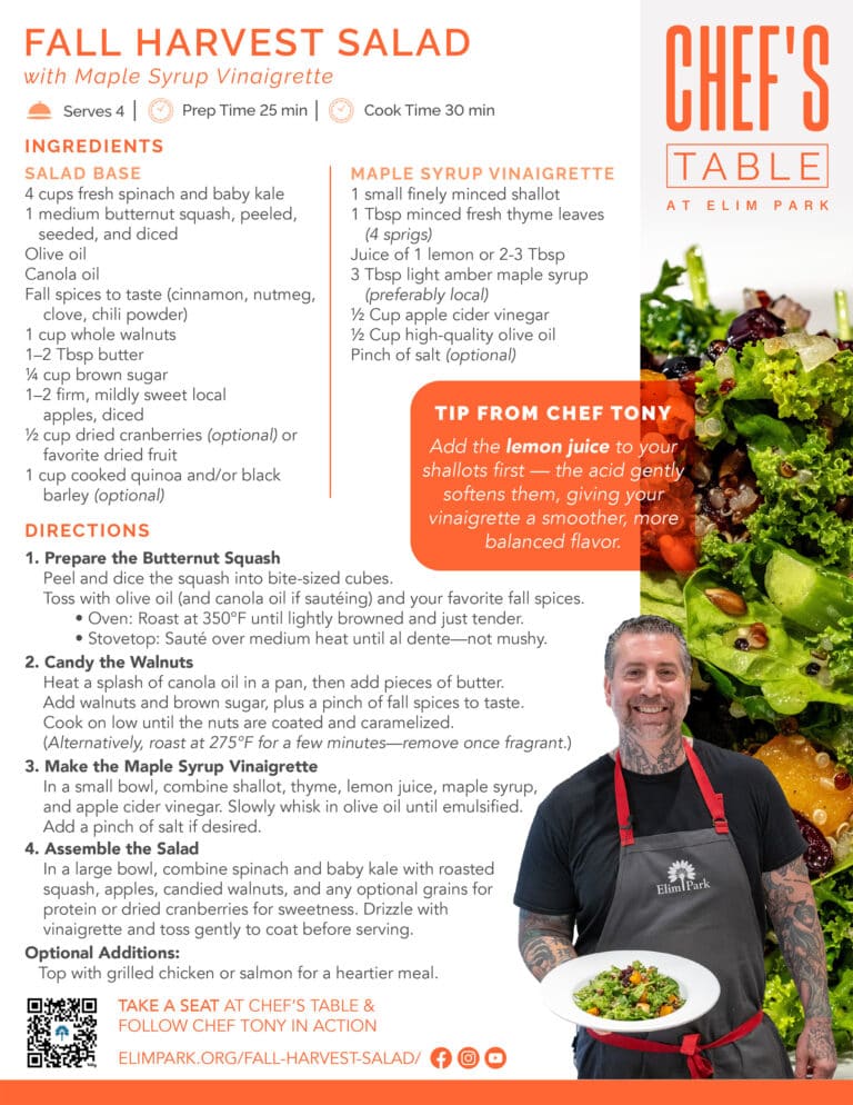 Experience the flavors of the season with our own Chef Tony from Elim Park, as he prepares his Fall Harvest Salad with Maple Syrup Vinaigrette. This vibrant, wholesome dish brings together roasted butternut squash, crisp local apples, and sweet candied walnuts, all tossed in a light, house-made maple vinaigrette that perfectly captures the taste of autumn.